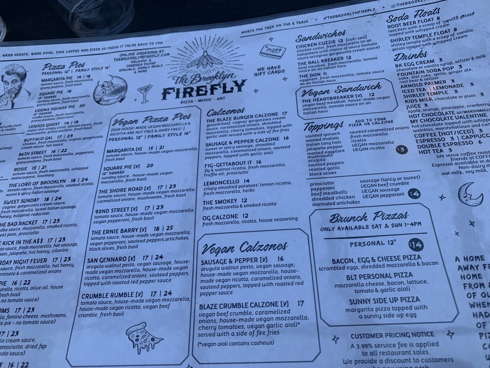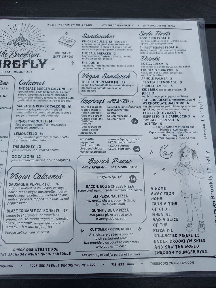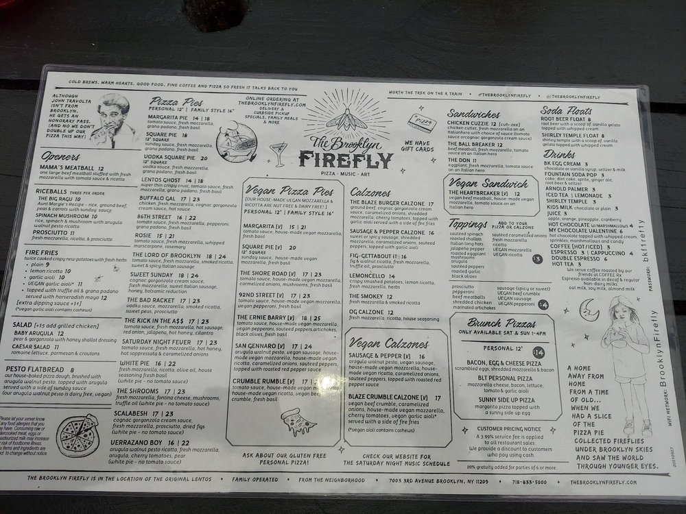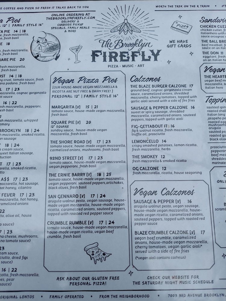Welcome to The Brooklyn Firefly, your new go-to spot nestled on 3rd Avenue. This vibrant bar specializes in an array of mouth-watering pizzas and delectable vegan options, ensuring everyone finds something to love. Dive into their unique Vegan Calzones, featuring a hearty Sausage & Pepper option or the flavorful Crumble Calzone with vegan meat crumble and blue cheese sauce. For sandwich lovers, the Chicken Cuzzie and The Ball Breaker deliver comfort in every hearty bite.
